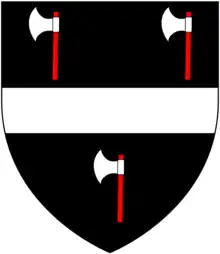 | Wrey: Sable, a fesse between three pole-axes argent helved gules. For Sir Bourchier Wrey, 5th Baronet (c. 1683-1726) of Tawstock Court, about 2 miles downstream of Barnstaple on the River Taw. A Cornish family which married the heiress of the Bourchier Earls of Bath, seated at Tawstock Court, heirs of the ancient feudal barons of Barnstaple. Today the Wrey baronets retain ownership of the estate of Tawstock, having sold Tawstock Court. | ||||