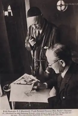 On 9 October 1914 he enlisted in the Royal Naval Volunteer Reserve, serving during World War I[3] until he was discharged in June 1916[4] having reached the rank of Lieutenant.[5] From 1916 to 1939 he produced numerous black and white illustrations for the boys' school stories in The Gem written by Charles Hamilton writing as Martin Clifford.[1] An article about Hamilton in the Picture Post in May 1946[1] that featured Macdonald and his artwork came to the notice of publisher Charles Skilton, who offered a contract to Hamilton for a hardback series of stories about Greyfriars School, the first volume of which, Billy Bunter of Greyfriars School, was published in September 1947. Macdonald produced a colour frontispiece and black and white illustrations for this and the subsequent 16 volumes until his death in 1954, when C. H. Chapman took over as illustrator.