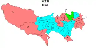 Single member results -- LDP in red, DPJ in light blue, Komeito in green