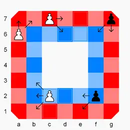 In general, forward movement means clockwise direction around the board; backward movement means counterclockwise direction. The squares comprising the board's inner and outer perimeters are called rings. The ring a rook or pawn currently stands on determines its orthogonal forward direction, and for a rook, its orthogonal backward direction. An orthogonal rook move in a direction immediately off its ring is called sideways movement.