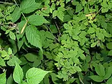 Rubus strigosus: foliage showing the large leaf of a first-year shoot, and the smaller leaves of a second-year shoot