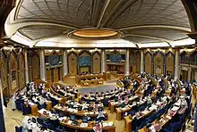 The king combines legislative, executive, and judicial functions[16] and royal decrees form the basis of the country's legislation.[17] The king is also the prime minister and presides over the Council of Ministers (Majlis al-Wuzarāʾ), which comprises the first and second deputy prime ministers (usually the first and second in line to the throne respectively), 23 ministers with portfolio, and five ministers of state.[18] The king makes appointments to and dismissals from the council, which is responsible for such executive and administrative matters as foreign and domestic policy, defense, finance, health, and education, administered through numerous separate agencies.[16] There is also a 150-member Consultative Assembly, appointed by the King,[19] which can propose legislation to the King but has no legislative powers itself,[20] including no role in budget formation. The government budget itself is not fully disclosed to the public. "Fully 40%" ... is labeled 'Other sectors' (including defense, security, intelligence, direct investment of the kingdom's revenues outside the country, and how much goes directly to the royal family).[21][22]