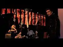 Fernandez singing while his on-screen ex-girlfriend and her boyfriend are on the back.
