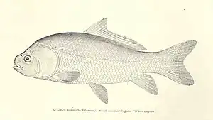 The smallmouth buffalo (Ictiobus bubalus, from the Greek for "bull-fish" and "buffalo") is one of the longest-lived fishes, capable of living more than a century.[2] They are a catostomid fish species native to the major tributaries and surrounding waters of the Mississippi River in the United States, as well as some other water systems where it has been introduced. It is a long-lived,[3][4][5][2] stocky fish like its relatives the bigmouth buffalo[6] (I. cyprinellus) and the black buffalo[6][2] (I. niger). The smallmouth buffalo's mouth is located ventrally like other Catostomidae species, whereas the bigmouth buffalo's mouth is terminal and opens forward. It is thought that smallmouth buffalo eyes are significantly larger than those of the black buffalo. Despite being members of different scientific families, these three species superficially resemble the common carp (Cyprinus carpio), but an easy and notable difference is that all catostomids lack the characteristic barbels of carp.