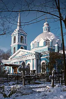 The cemetery has two churches. The older church is dedicated to the Theotokos of Smolensk. The azure-painted Neoclassical building was erected between 1786 and 1790. The Bolsheviks closed the church for worship between 1940 and 1946.[3] The newer Smolensky Cemetery Resurrection Church (1904), as of 2016 under repair, is dedicated to the Resurrection of Christ. It is the only example of Naryshkin Baroque in Saint Petersburg. The church used to be known for its dazzling Neo-Baroque icon screen with a set of Vasnetsov icons. Other buildings on the grounds included the first wooden church, that of Michael the Archangel (destroyed by the Saint Petersburg flood of 1824), then rebuilt in stone as a Church in honor of the Holy Life-giving Trinity (1831–1932) and an almshouse designed by Luigi Rusca.