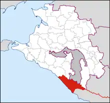 By the end of Russo-Circassian War, the Russian Empire aimed to systematically destroy the native Circassian people in the region[26][27][28] and several atrocities were committed by the Russian forces.[29][30] As a result, almost all Ubykhs and a major part of the Circassians who lived on the territory of modern Sochi, were either killed or expelled to the Ottoman Empire in the Circassian Genocide. According to Russian sources, Sochi's population fell from roughly 100,000, to 98.[31][32][2]