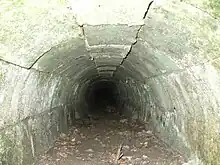 During excavations a drainage culvert was discovered about 20 m (22 yd) west of Terminus bridge.[31] Work resumed in September and November 2014 to batter and reshape the canal embankments. Excess topsoil was removed and the towpath reinstated on the stretch to the east from Terminus bridge for about 200 m (220 yd). On the same stretch a retaining wall was discovered in the south embankment continuing for about 100 m (110 yd), possibly built as a repair to a weak section of canal banking. Vertical infills of white clay have been used along this wall.