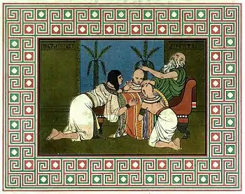 Rebecca overheard this conversation. It is suggested that she realized prophetically that Isaac's blessings would go to Jacob, since she was told before the twins' birth that the older son would serve the younger.[16] Rebecca blessed Jacob and she quickly ordered Jacob to bring her two kid goats from their flock so that he could take Esau's place in serving Isaac and receiving his blessing. Jacob protested that his father would recognize their deception since Esau was hairy and he himself was smooth-skinned. He feared his father would curse him as soon as he felt him, but Rebecca offered to take the curse herself, then insisted that Jacob obey her.[17] Jacob did as his mother instructed and, when he returned with the kids, Rebecca made the savory meat that Isaac loved. Before she sent Jacob to his father, she dressed him in Esau's garments and laid goatskins on his arms and neck to simulate hairy skin.