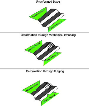Strain partitioning is also known as a procedure for decomposing the overall strain into individual deformation mechanisms which allowed for strain to be accommodated.[14] This approach is performed from geometrical analysis of rocks on the grain – crystal scale.[14] Strain partitioning of deformation mechanisms incorporates those mechanisms which occur both simultaneously and/or subsequently as tectonic conditions evolve, as deformation mechanisms are a function of strain rate and pressure-temperature conditions.[14][16] Performing such a procedure is important for structural and tectonic analysis as it provides parameters and constraints for constructing deformation models.[16][20]