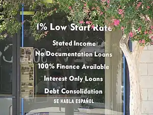 "The FBI defines mortgage fraud as 'the intentional misstatement, misrepresentation, or omission by an applicant or other interest parties, relied on by a lender or underwriter to provide funding for, to purchase, or to insure a mortgage loan.'"[132] In 2004, the Federal Bureau of Investigation warned of an "epidemic" in mortgage fraud, an important credit risk of nonprime mortgage lending, which, they said, could lead to "a problem that could have as much impact as the S&L crisis".[133][134][135][136] Despite this, the Bush administration prevented states from investigating and prosecuting predatory lenders by invoking a banking law from 1863 "to issue formal opinions preempting all state predatory lending laws, thereby rendering them inoperative."[137]