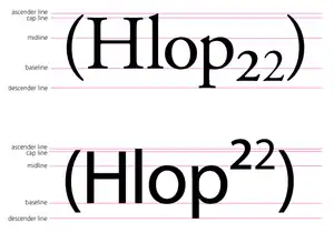 Example of subscript and superscript. In each example the first "2" is professionally designed, and is included as part of the glyph set; the second "2" is a manual approximation using a small version of the standard "2". The visual weight of the first "2" matches the other characters better. (The top typeface is Adobe Garamond Pro; the size of the subscript is about 62% of the original characters, dropped below the baseline by about 16%. The second typeface is Myriad Pro; the superscript is about 60% of the original characters, raised by about 44% above the baseline.)