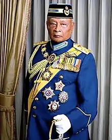 Sultan Haji Ahmad Shah Al-Musta’in Billah ibni Almarhum Sultan Abu Bakar Ri’ayatuddin Al-Mu’azzam Shah (Jawi: المرحوم سلطان حاج أحمد شاه المستعين بالله إبن المرحوم سلطان أبو بكر رعاية الدين المعظم شاه; 24 October 1930 – 22 May 2019) was Sultan of Pahang from 1974 until his abdication in 2019, and previously the seventh Yang di-Pertuan Agong, the constitutional monarch of Malaysia from 1979 to 1984. His abdication as Sultan was decided by the Royal Council at an extraordinary meeting on 11 January 2019. A special amendment was passed on the state constitution that gave the body more power for this decision, citing the Sultan's incapability to rule due to his failing health.[2] The abdication announced the next day which was retroactively effective on the day of the Royal Council meeting, paving the way to his son, Abdullah to succeed him as Sultan immediately, and subsequently be elected as the next Yang di-Pertuan Agong later the same month.[3]