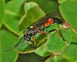 Adults of Tenthredopsis scutellaris can reach a length of 8.5–12 millimetres (0.33–0.47 in).[3] Thorax is black, with a yellow stripe along the forehead and yellow scutellum and postscutellum. The legs are brown, but the hind legs are black. The wings are clear with brown veins.[4] Sexual dimorphism is not conspicuous, but in males the rear thigh is rather light, while in the females it is dark. Moreover in the females the abdomen is black with a central broad red band.[5]