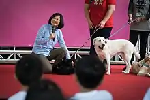 Tsai adopted the dogs in October 2016, and their names are Bella, Bunny and Maru. She signed their adoption papers at a ceremony organised by the Huikuang Guide Dog Foundation, where she vowed to improve the barrier-free environment for visually impaired people and their seeing-eye dogs.[23] Of the three dogs, Tsai has described Bella as her favourite; while Bunny is 'elegant' and Maru is 'timid'.[24]