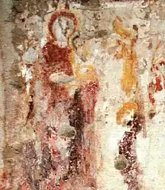 The central hall also had multiple layers of painted plaster, the amount varying from wall to wall.[30] Its east wall housed a large nativity scene featuring the Virgin Mary lying on a mattress, a crib with the Christ Child, angels and, on the left side of the painting, the three Biblical Magi. The colour scheme is mostly limited to yellows, oranges, reds and violets.[31] The eastern part of the south wall features a fragmentary depiction of Archangel Michael and the Holy Trinity, while the western part was divided into two scenes, one showing Mary holding the Christ Child, who reaches out for a palm tree. Again the colours are mostly limited to violet, yellow and red.[32] The iconography of this last scene is unique in a Makurian context.[33] The other scene from the western part of the south wall initially featured the Transfiguration, but was later painted over with the Holy Trinity and a (barely preserved) king wearing a horned crown.[34] On the west wall a king with a scepter and a Byzantine crown, as well as two standing figures with halos, can be seen. The north wall features a large cross, a priest and a king, who wears a crown, a blue veil and a white robe. A later layer of painted plaster added the twenty-four elders from the Book of Revelation, depicted wearing white robes and wielding palm leaves, while sitting on thrones.[35]