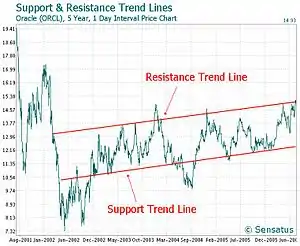 In finance, a trend line is a bounding line for the price movement of a security. It is formed when a diagonal line can be drawn between a minimum of three or more price pivot points. A line can be drawn between any two points, but it does not qualify as a trend line until tested. Hence the need for the third point, the test. Trend lines are commonly used to decide entry and exit timing when trading securities.[1] They can also be referred to as a Dutch line, as the concept was first used in Holland.