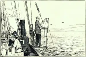 An illustration of the operation of depth sounding equipment aboard USFC Grampus in the Nantucket Shoals area off Massachusetts, published in 1893 in Report of the Commissioner for 1889 to 1891.