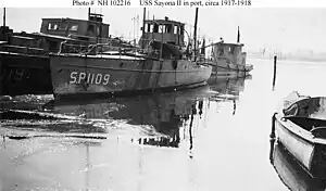 ![]() USS Sayona II (SP-1109) in port in icy waters in the 5th Naval District during the winter of 1917-1918. At left is the patrol vessel USS Idylease (SP-119). | |