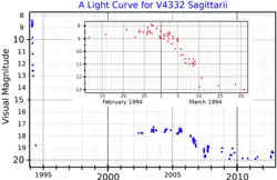 A visual band light curve for V4332 Sagittarii. The main plot, adapted from Tylenda et al. (2015),[1] shows the long-term variability, and the inset, adapted from Martini et al. (1999),[2] shows the variation during the first weeks of the eruption.