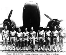 VMF-221 was commissioned on July 11, 1941, in Naval Air Station North Island, San Diego, California.[1] In December of that year, following the attack on Pearl Harbor, the squadron moved to Marine Corps Air Station Ewa, Hawaii. On December 25, 1941, fourteen Brewster F2A-3's landed on Midway Island after launching from the USS Saratoga. These aircraft were originally part of a relief force bound for Wake Island, but were diverted to Midway instead after the force was controversially recalled on December 22, 1941, Wake Island fell on the following day.[4] On March 1, 1942, VMF-221, VMF-222, VMSB-241, and their headquarters units formed Marine Aircraft Group 22 (MAG-22) commanded by Lieutenant Colonel Ira L. Kimes.