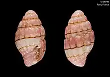 The small, stout shell has a fusiform shape. The whorls show prominent, rounded shoulders and a series of strong axial ribs. The columella has four plaits. The shells of living examples have two dark-brown spiral lines on the body whorl that enclose a milk-white band. [3]