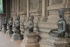 Wat Ongtue, also called "the temple of the heavy Buddha", has a 16th century Buddha image, which weighs ten tons (10,160 kg). It was built by King Saysethathirath and is on the Wat Ongtue-Sethathirath Road.[2] It is a said that the temple site was used in the 3rd century for religious purposes. The temple was destroyed in the Siamese–Laos war and rebuilt in the 20th century. The deputy patriarch of the monastic order resides there and heads the Buddhist institute for monks who come from all over the country for training in the Buddhist Dhamma. The heavy Buddha statue is 5.8 metres (19 ft 0 in) in height and is on the back side of the sim and is flanked by two more standing Buddha statues.[31]