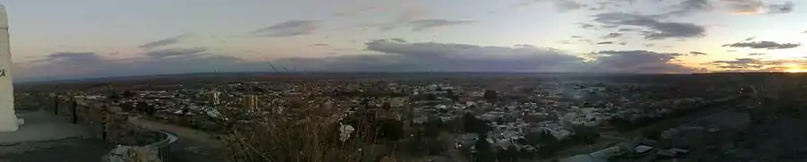 Villa Regina lies 250 meters (820 feet) above sea level and is located along the Upper Río Negro (Black River) valley. It is within the limits of the General Roca department in the eastern Rio Negro province of northern Patagonia. Situated nearly 100 kilometers (62 miles) east of Neuquén and 500 kilometers (310 miles) northwest of Viedma, it is connected to the other cities in the orchard-rich Río Negro Valley via Highway 22. The region's landscape is characterized by a plateau to the north, the Río Negro Valley, and a plateau to the south. The plateaus have an average height of 100 meters (330 feet). The town encompasses the territory between the northern plateau and the productive areas near the Río Negro's border, which runs along the southern plateau.[28] It has an irregular street system, with a mixture of old and modern buildings in its center.[29] The flora is typical of the Patagonian steppe and includes small bushes with scarce spiny foliage like larrea, alpataco and atriplex lampa.[30]