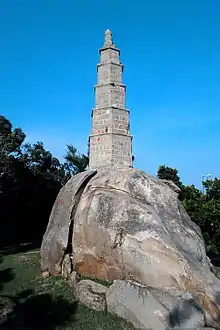 The pagoda was built in 1387 during the 20th year of Hongwu Emperor of Ming Dynasty by Marquess Chianghsia Chou Te-hsing.[2][3] It was built to serve as navigational marker for ships negotiating the treacherous waters near Kinmen and also for defense of Kinmen from the Japanese pirates. The tower is classified as second grade national historic relic.[4] The tower was damaged during an earthquake in 1918 and also in 1961 due to war.[5]