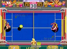 When playing against computer opponents, the player plays one match against each character (with the next character's difficulty increasing each time) until all are defeated, thus winning the game. When playing 2-player versus, one match is played between the two players. A match consists of 3 sets that last 30 seconds by default and up to 99 seconds on the arcade version (with the timer not stopping when a point is scored, unlike most sports). A set ends when either a player reaches 12 points (in which case that player wins the set) or 30 seconds have elapsed (after which the player with the most point wins the set). If the set ends in a tie, a set win is given to both players. A match is won by winning two sets, but if players tie in both of the first two sets (giving each of them two wins), the game enters a sudden death round in which the first player to score in any way wins the match.