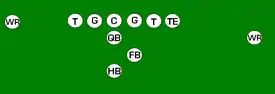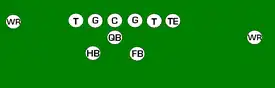 One variation of the T Formation would be where all the running backs would be closer than usual, being at fullback depth rather than halfback depth. Another variation of the "balanced T" formation is the so-called "unbalanced T" formation.[2] In this configuration the line of scrimmage has an end and tackle left of center, while to the right of the center are two guards, a tackle, and an end. This creates a line that is weighted toward the right of the center. With the backfield lining up in the conventional T formation behind the center (quarterback, two halfbacks and fullback), the resulting configuration is "unbalanced" due to the asymmetry of the placement of the linemen. The "split T" spreads the offensive line out over almost twice as much ground compared to the conventional T formation. This causes the defensive line to also spread out, creating gaps the offense can exploit.[3]