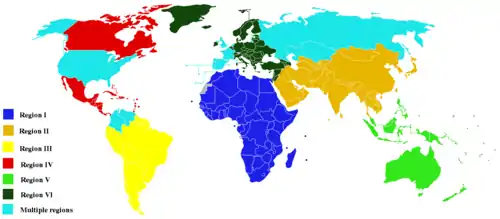 The member states of the World Meteorological Organization divided into the six regional associations, shown on a world map