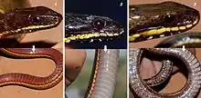 This snake is brown above, with or without darker spots and with a more or less distinct paler dorsolateral band. The lower parts are cherry-red to purplish-black, with a yellow band on each side extending from the lips to the end of the tail. Total length is two feet, and the tail is 5.5 inches.[2]