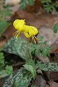 Erythronium americanum, the trout lily, yellow trout lily, or yellow dogtooth violet, is a species of perennial, colony forming, spring ephemeral flower native to North America and dwelling in woodland habitats. Within its range it is a very common and widespread species, especially in eastern North America.[3] The common name "trout lily" refers to the appearance of its gray-green leaves mottled with brown or gray, which allegedly resemble the coloring of brook trout.[4][5]