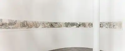 In exhibitions at James Cohan Gallery ("Water That Floats the Boat Can Also Sink It," 2007; "Mistaking Each Other for Ghosts," 2010), Ji's epic, cautionary scrolls delved further into the project, portraying migration in physical and psychic terms that emphasized loss and a literal haunting of those supplanted by melancholic wraiths and scraggly scavengers (e.g., Last Days Before the Flood, 2006).[31][6][35] In the latter show, Ji was inspired by the ghost stories of the 18th-century Chinese writer Pu Songling and the French writer, Marquis de Sade, in several works linking Sade's decadent noblemen to contemporary Chinese political leaders.[44][19] The show included the ten-foot-wide horizontal scroll, Migrants of the Three Gorges Dam (2009), which was hand-printed from 500 carved woodblocks. It portrayed dispossessed farmers and flooded landscapes alongside calligraphic reports and descriptions of the flooding of the Yangtze River based on Ji's own research, interviews and observations.[19]