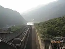The concrete spillway was constructed to the north (right bank) of the dam and consists of a multi-level open channel controlled by three radial gates. Due to a large volume of unstable sandstone, clay and shale that comprised the slope where the spillway was to be built, about 6,040,000 cubic metres (213,000,000 cu ft) of material had to be removed before concrete placement could begin. Construction of the spillway was carried out simultaneously with the main dam. The spillway can discharge up to 9,470 cubic metres per second (334,000 cu ft/s) when all the gates are open.[12] The dam is also equipped with two sluice gates for de-silting operations, and two flood outlet tunnels with 160 cubic metres per second (5,700 cu ft/s) capacity.