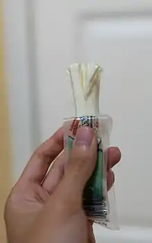 - A short, cylindrical, usually individually-wrapped serving of string cheese (or, less commonly, other non-string cheeses).