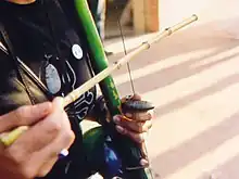 Dobrão usado por uma tocadora de berimbau (A dobrão being used by a berimbau player)