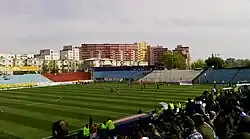 Ultimately from Ancient Greek στάδιον (stádion). Compare German Stadion, French stadion, Polish stadion, Russian стадион (stadion), Yiddish סטאַדיאָן (stadyon).