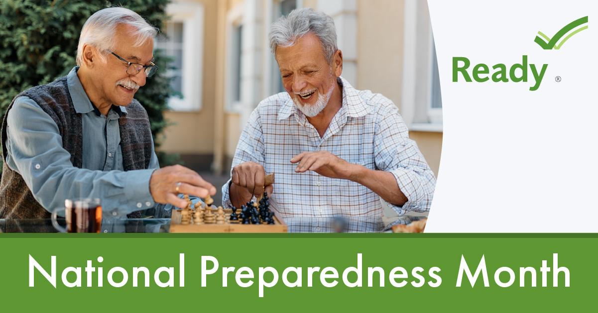 A group of older adults smiles with their hands together. National Preparedness Month.